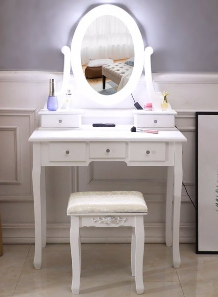 This Dressing Table is our latest design. There are 10 small light bulbs on the elliptical mirror. The light is white, which can provide good illumination for night and dressing. This product includes two storage boxes, three drawers, bent legs and a dressing stool. And it uses solid MDF plate production, with delicate crystal handle and fashion carving technology, all of which will bring you a new and fresh feeling. At the same time, this dressing table has removable mirror and storage boxes, which can be used as a workbench and a desk to provide you with different functions.